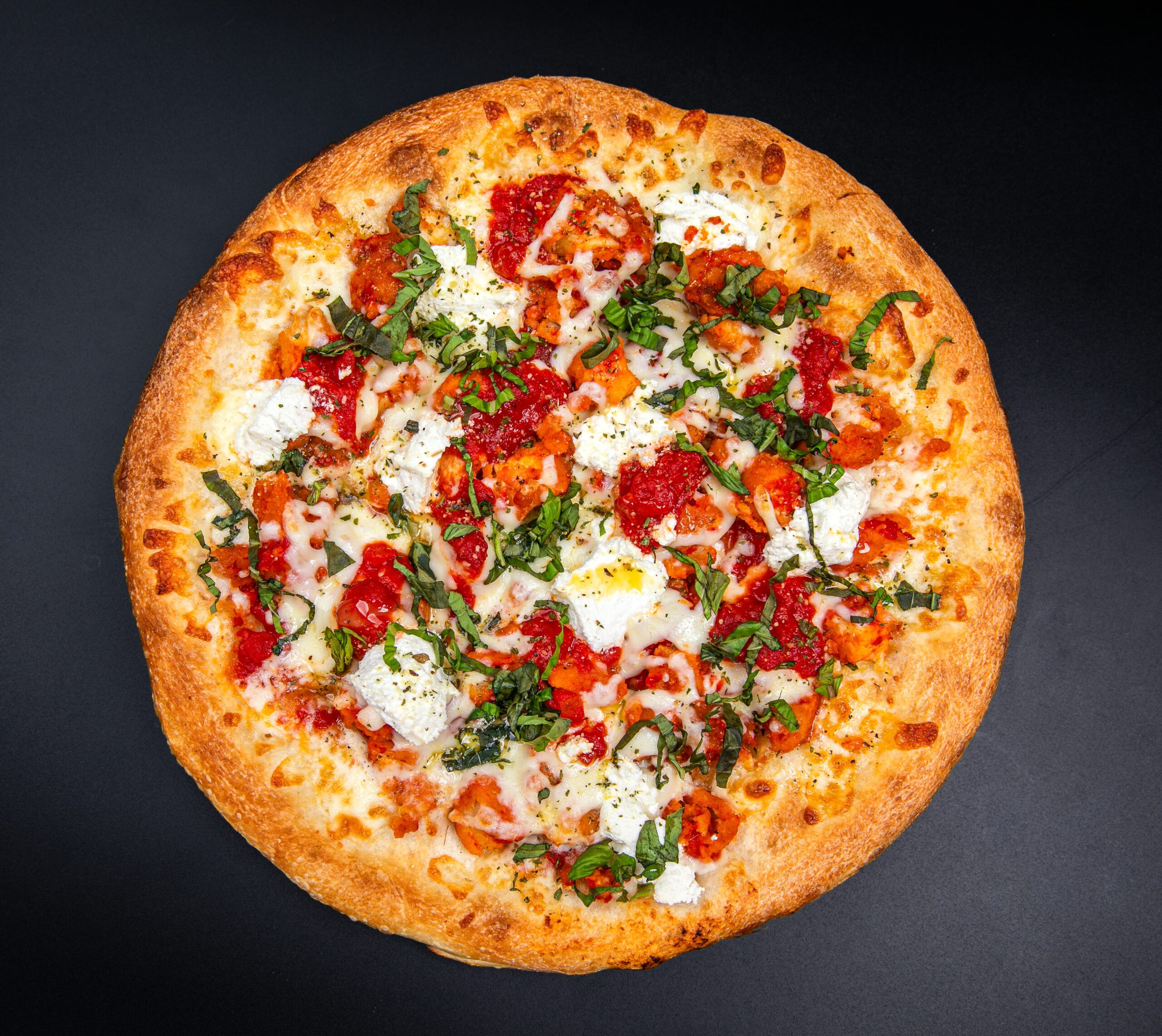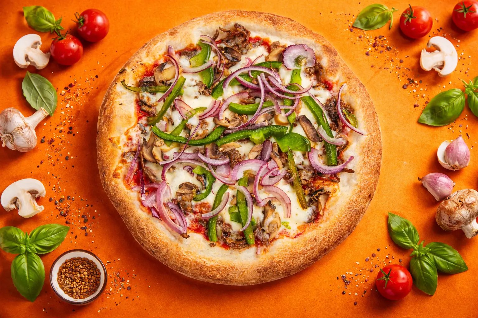 Tender seasoned steak layered with fresh green peppers, onions, and mushrooms over our rich tomato sauce, finished with melted mozzarella on a perfectly baked crust. A bold, savory pizza packed with classic Philly-style flavor.